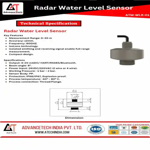0-30 meter water level radar sensor with an accuracy of +/- 1 mm. Bolt mountable, made in India, designed for precise and reliable level measurement.