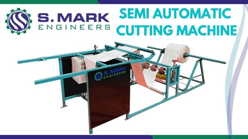 A 1 HP metal cutting machine for PP/HDPE/Leno bags. Features 32-inch blade, semi-automatic operation, and 1500 bags/hour capacity.