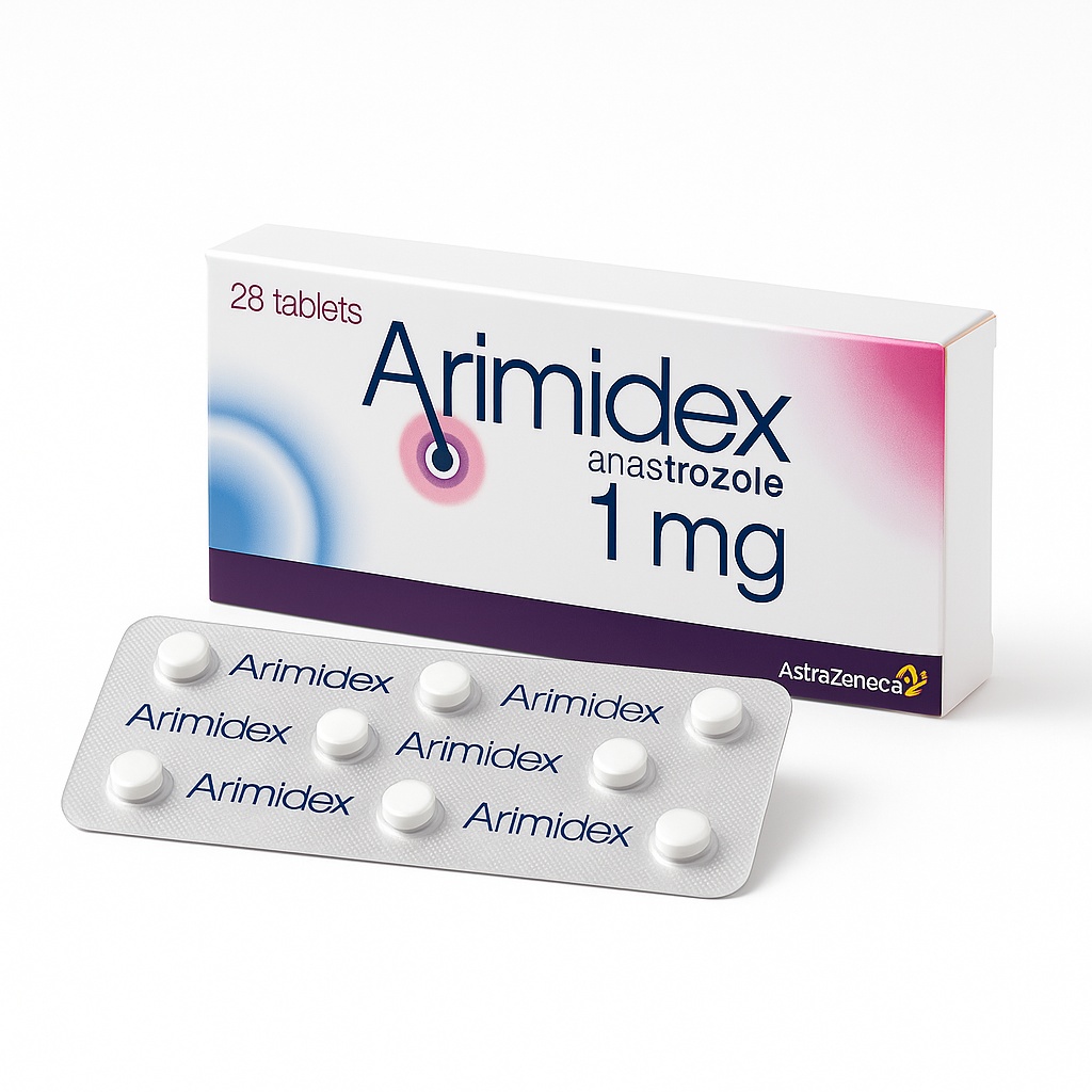 Anastrozole 1 mg tablets for breast cancer treatment. Prescription medication in tablet form, packaged in a box. Contains Anastrozole as the active composition.