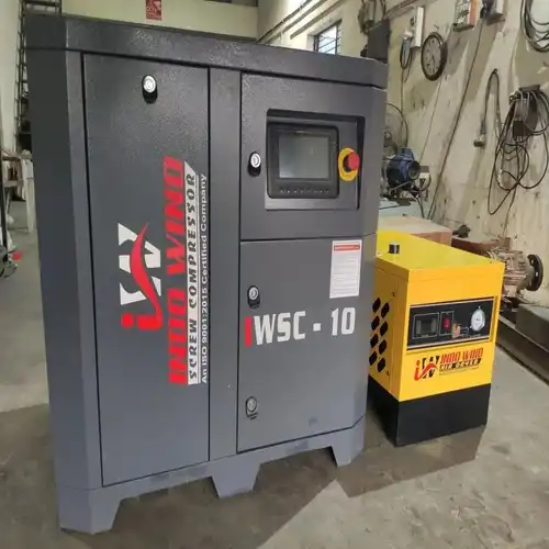 India-made 10 HP screw compressor, air-cooled. Features Class I air quality and a maximum flow rate of 40 cfm. Installation and spares available.