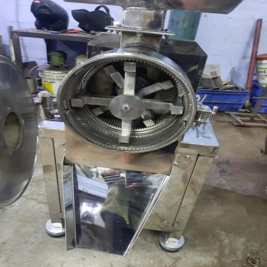 Commercial 10-inch double chamber pulverizer for chutney and masala. Features 5 HP motor, Stainless Steel construction, and three-phase power connection. Made in India.