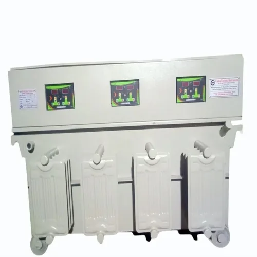 Oil-cooled, 10 kVA servo voltage transformer with 0.5 accuracy class. Operates from 120-280 V input to 400/415 V output, 0-45°C operating temperature.