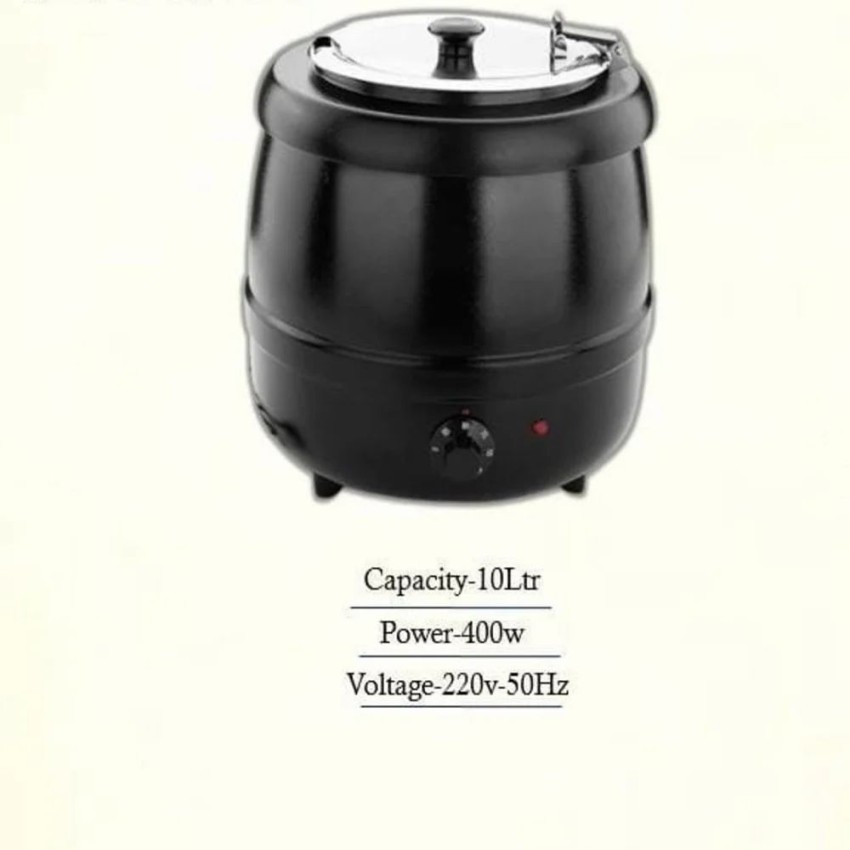 10-litre stainless steel electric soup warmer kettle. Operates on 220V, 50Hz, with a 400W power consumption. Available in stock.