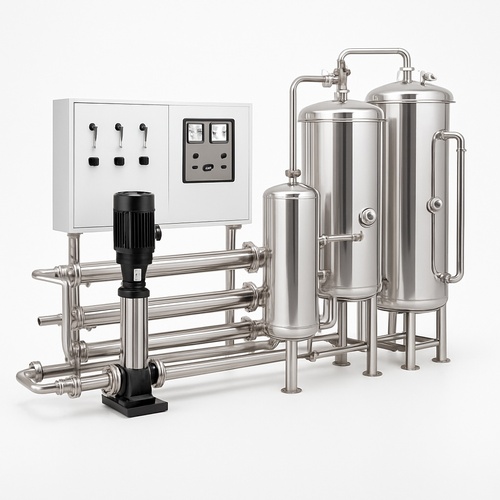 Pharmaceutical-grade 100 LPH water treatment plant. Stainless steel construction, 50% recovery rate, preliminary treatment stages, suitable for borewell water.