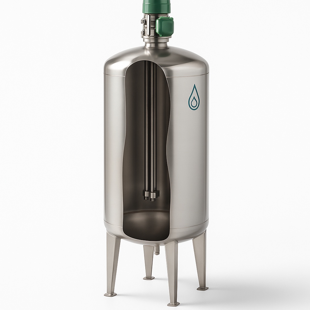 Semi-automatic 1000L polished stainless steel mixer vessel. Designed for water storage with a maximum design pressure of 10 bar.