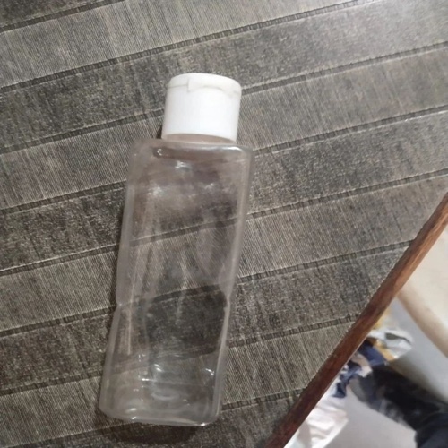 Transparent, square 100ml PET bottle with flip-top cap. Standard design, ideal for shampoo or hair oil. Minimum order quantity 1000 pieces.
