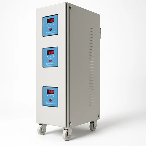 This 10KVA, three-phase industrial servo stabilizer features 270V input, copper material, and a 20V/Sec correction rate for precise voltage regulation.