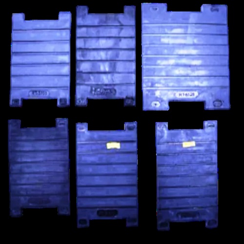 10mm thick grooved rubber sole plates, blue in color. Made from durable rubber for railway use in India. Provides essential cushioning and support for rail infrastructure.