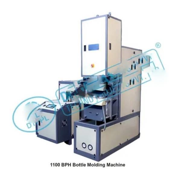 Semi-automatic bottle molding machine with 2 cavity, 8 Ton clamping force. Processes PET pre-forms with 1100 BPH capacity, 35 HP power consumption.
