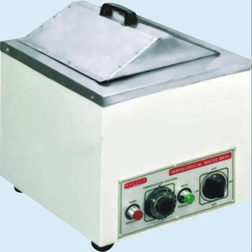 12-liter serological water bath operates on 230V, single phase, 50 Hz. Features a chamber size of 300x175x175mm and maintains a stable 37°C temperature.