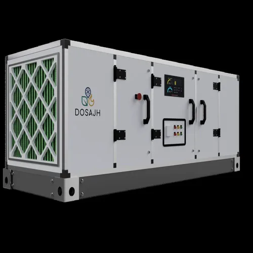 This painted, grey, double skin air handling unit operates at 220V and delivers 1200 CFM capacity. It comes packaged in a wooden box for secure transport.