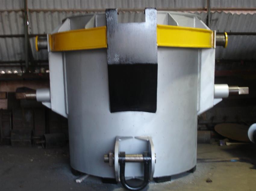 15-ton capacity MS ladle for industrial pouring. Operates on 230V, 50Hz, three-phase power. Open ladle shell design, made in India.