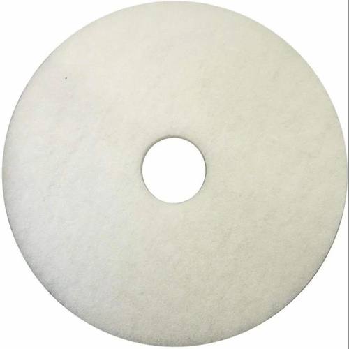 17-inch round floor scrubbing pad. Made of non-woven nylon/polyester fiber. Available in white, red, green, and black. Ideal for floor polishing and scrubbing applications. Pack of 5.