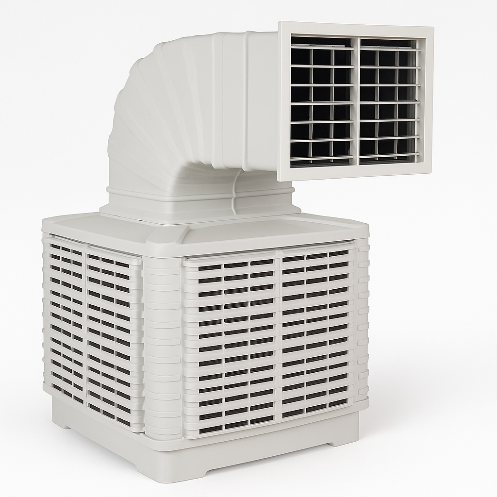 Plastic industrial duct air cooler with 65L tank, 3.0 kW power, and 18000 CFM airflow. Features 100mm honeycomb pads and 80 dB noise.
