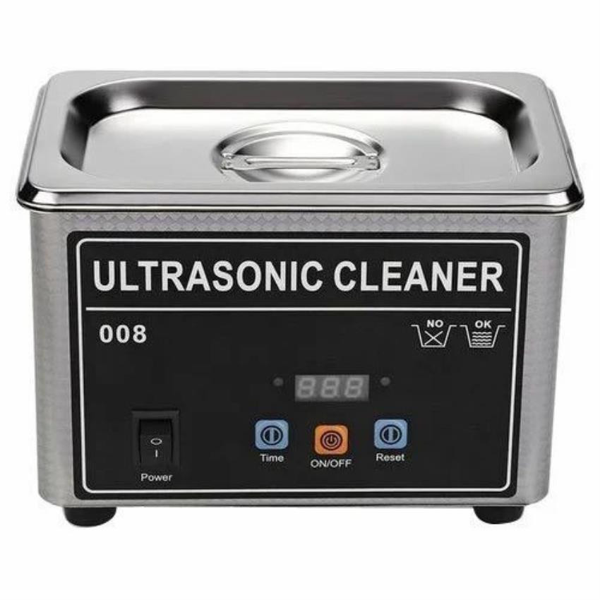 1L stainless steel ultrasonic cleaner with digital display. Operates on 220-240V, 50Hz, features 30 kHz ultrasonic frequency, and heats up to 80°C.