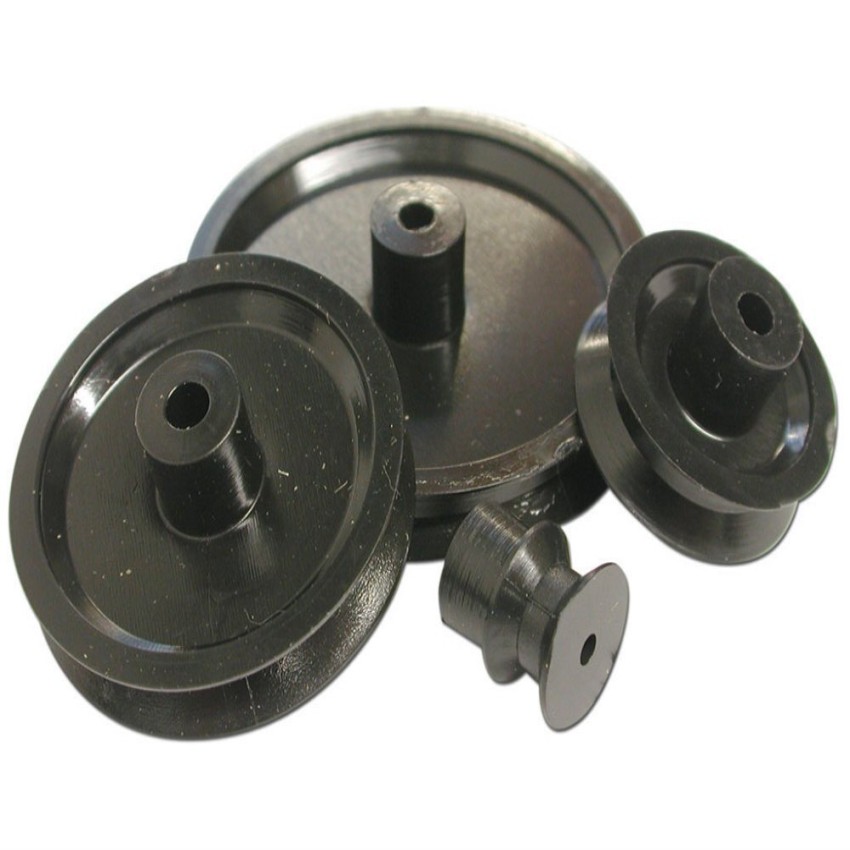 Round plastic pulley, 2 to 8 inch diameter. Capacities range from 0.5 to 2 ton. Polished surface finish, rust-resistant. Made with hot-rolled technique.