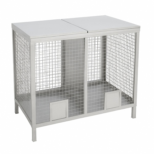 Rectangular stainless steel bin for onions and potatoes. Features 2 chambers with 35-50 Kg capacity. Ideal for kitchen use, stands 1.5 to 2.5 feet tall.