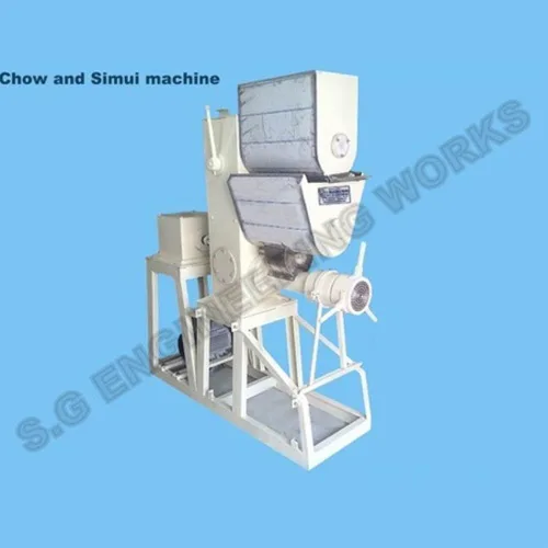 Semi-automatic noodle extruder machine with 50-300 kg/hr capacity. Features 3-phase, 440V operation, SS and MS body, and 1-year warranty.