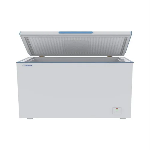 Medium 200 Liter Blue Star Deep Freezer. Stainless steel body, top open door, and industrial application. Operates at 80°C temperature range, 2 KW energy consumption. Made in India.