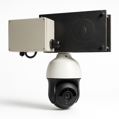 Fixed 360-degree rotating camera for industrial applications. Operates on 220V control voltage and power. Made in India.