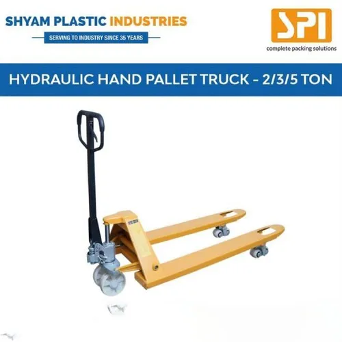 2.5 ton capacity hand-operated pallet truck made of mild steel. Features nylon wheels and is designed for material handling applications in India.