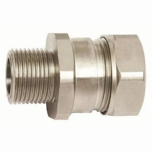 Flameproof brass cable gland, 25mm diameter. Polished grey surface treatment. Suitable for electrical product accessories in industrial settings. Made in India.