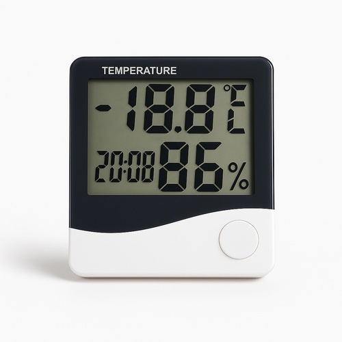 Digital thermo humidity meter with a temperature range of -50 to 70°C and humidity range of 10-99% RH. Uses AAA 1.5V batteries. Accurate temperature readings.