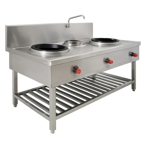 Commercial gas cooking range featuring 3 burners, constructed from stainless steel. Designed for restaurant applications, powered by gas. Made in India for reliable commercial kitchen performance.