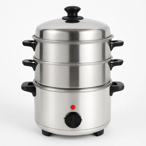 Electric stainless steel multi steamer cooker, 2L capacity, with 3 plates. Suitable for induction and oven use, this domestic machine is dishwasher safe.
