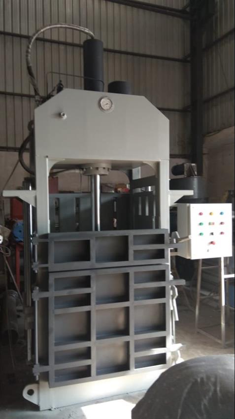 Three-phase, semi-automatic hydraulic bailing press (HBPA-15) with 0-30 ton capacity and 5 HP motor. Produces 60 Kg bales, 100L oil tank.