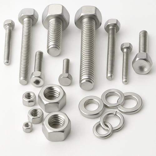 Grade 316 stainless steel nuts, bolts, and washers. Round shape, corrosion-resistant. Ideal for automotive, pharmaceutical, oil & gas, and construction industries. Packaged in cartons or jute bags.