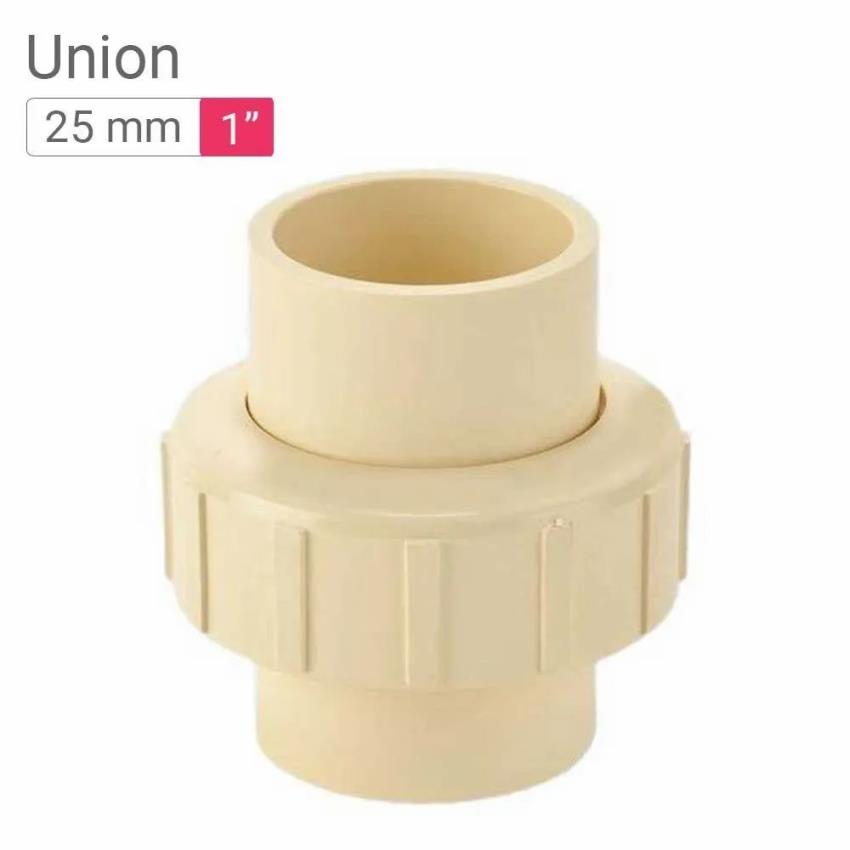 CPVC pipe union fitting, 3/4 inch diameter. Made from CPVC material, cream colored. Complies with ASTM D2846(SDR-11) standard for plumbing applications. Packaged in boxes.