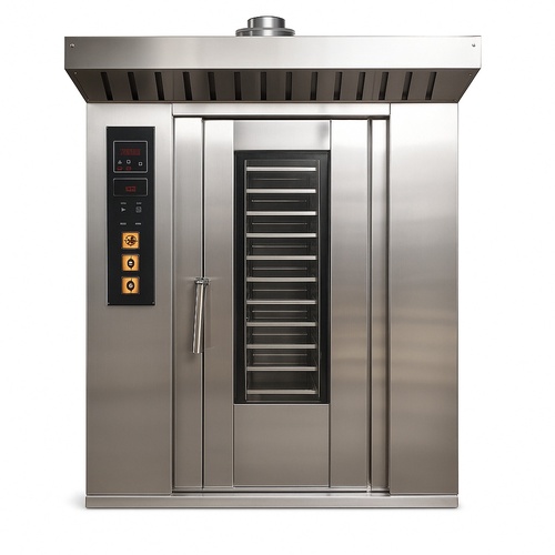 Automatic 36-tray rotary rack oven for bakeries. Stainless steel construction, 250-300Kg capacity. Operates on diesel or electric power. 1-year warranty.