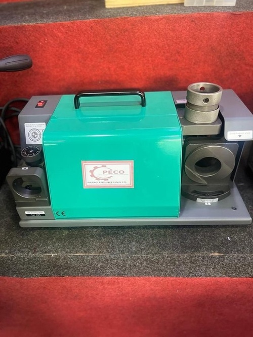 New, green, single-phase electric drill bit grinder for carbide and HSS bits. Features a 4-inch disc diameter, 20mm collet chuck size, and 1-year warranty. Weighs 50 kgs with collets.