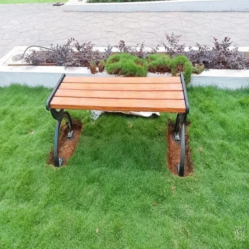 Four-seater iron garden bench, durable construction for outdoor use. Features a footrest but no backrest or armrests. Requires DIY assembly.