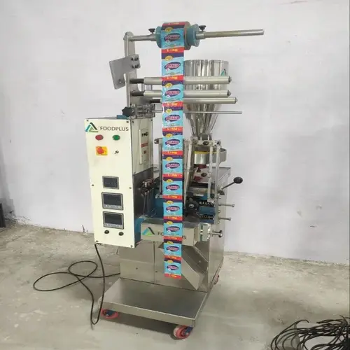 Automatic pouch filling machine with 4-side sealing. Fills liquids in 10-50g and 200-400g pouches. 0-1 HP motor power.