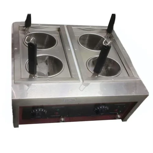 Stainless steel 4-stage pasta boiler with 6kw capacity. Polished finish, size 180x180x130mm. Rectangular shape. MOQL: 5 pieces.