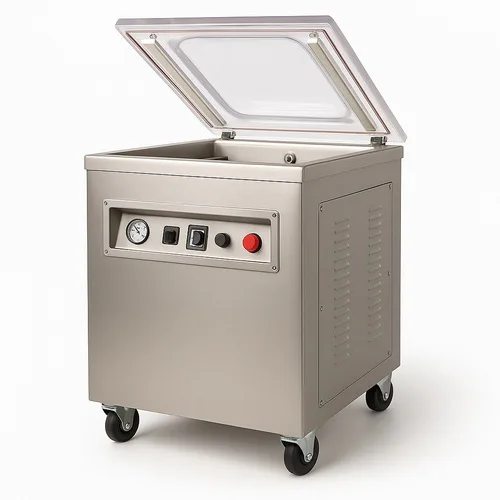 Single chamber vacuum packaging machine with 400mm sealing width and 2mm sealing line. Features 750W power consumption, operating on 220V/50Hz electrical supply.