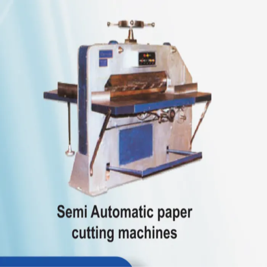 Semi-automatic paper cutting machine with 3 HP power. Features over 100 cuts per minute and a cutter size exceeding 32 inches. Analog display type.