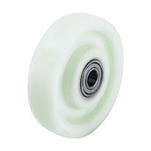 White 4x1.5 inch Nylon trolley wheel. Load capacity 100-500kg. Designed for trolleys or carts. Without brake. Minimum order quantity applies.