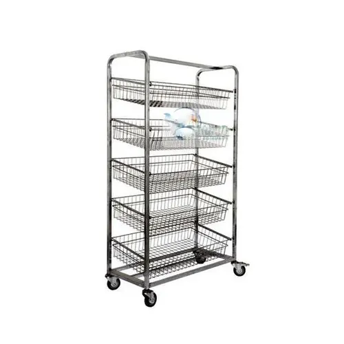 This 5-basket vegetable trolley is crafted from stainless steel with a four-wheel design. It offers a substantial load capacity of 50 kg, suitable for efficient produce handling and transport.