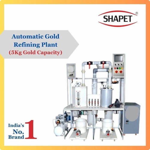 Fully automatic gold refining plant, 5 kg capacity, 7.5 Kw power. Operates on 230/415 V, single/three phase. Polypropylene body, 6-7 hour cycle time.