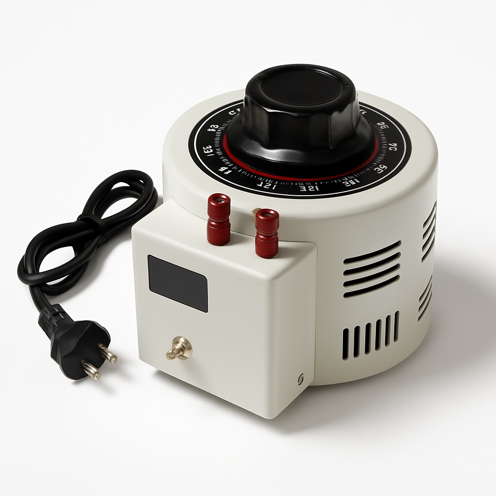This 5 kVA auto transformer provides variable voltage output. Designed as a dimmerstat or variac, it is typically rated for 240V AC input and can be manual or motorized.
