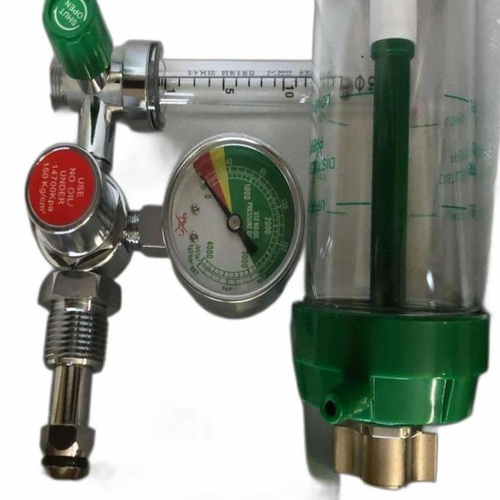 Polycarbonate oxygen flowmeter with 5 LPM flow rate and 30 Bar output pressure. Features humidifier bottle. Designed for hospital pipeline usage.
