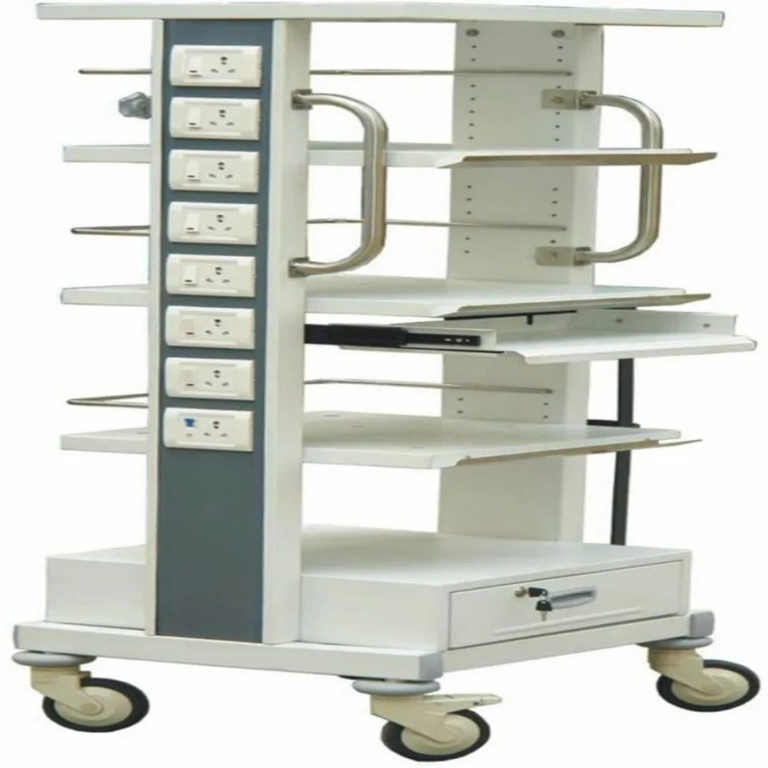 Mild steel monitor trolley, silver finish, with 5 shelves and 4 wheels. Features 150mm castors for smooth movement. Corrosion-resistant, ideal for hospital use.