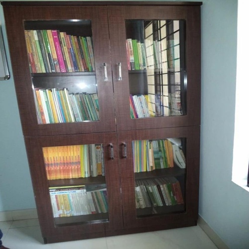 Wooden office almirah with 5 shelves, hinged doors, and locker. White color, polished finish. Assembly and onsite assembly provided. 1-year warranty.