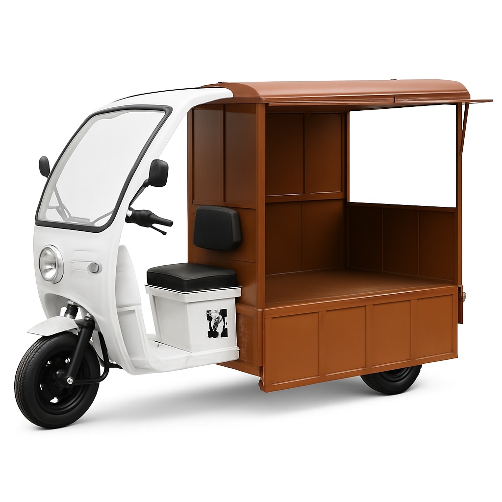 Electric food cart with 500 Kgs loading capacity. Features 3 wheels, 1 KW motor, 110V, and a max speed of 25 Km/h. Offers 60 Km per charge. Lead acid battery.