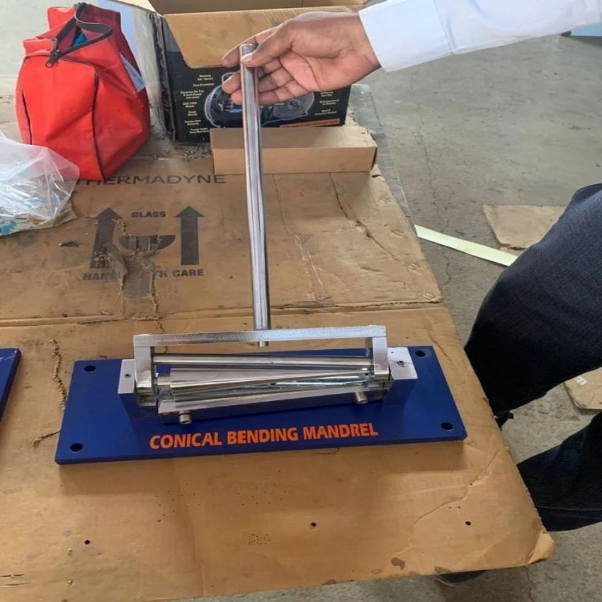 MS conical bend tester for laboratory use, 50Hz frequency. Features 300W power consumption and tests up to 2mm thickness. Made in India.