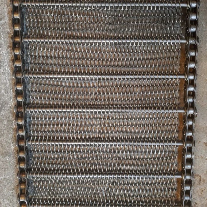 Silver stainless steel wire mesh conveyor belt, 5 mm thickness. Designed for industrial applications with a durable wire mesh construction.
