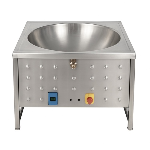 Restaurant gas range electric kadai with 6-litre capacity. Ideal for frying namkeen, fries, and samosas. Compact tabletop design, 19" x 19" x 19" dimensions, 14kg weight. Made in India.